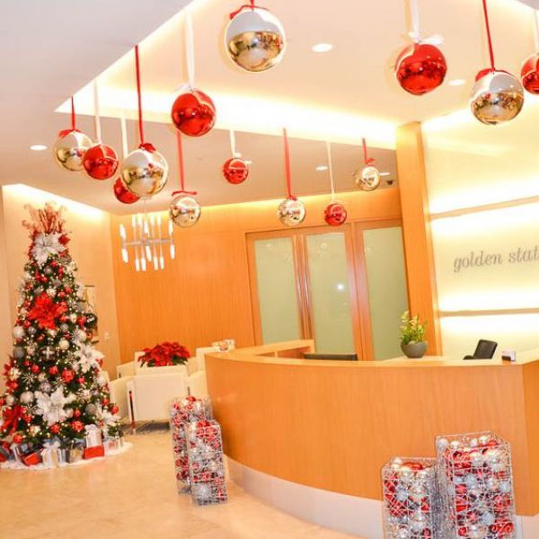 - Οι διακοσμήσεις σε επαγγελματικούς χώρους τοποθετούνται συνήθως πάνω σε τραπέζια, πάγκους ή στο πάτωμα. Αυτό που πολλοί δεν συνειδητοποιούν είναι ότι το ταβάνι είναι μία πολύ έξυπνη επιλογή. Αξιοποιήστε το στο έπακρο δημιουργώντας ένα σκηνικό που συμπληρώνει την διακόσμηση. Κρεμάστε χριστουγεννιάτικα φωτάκια , διακοσμητικές γιρλάντες, στεφάνια και στολίδια από την οροφή ή τους τοίχους. Αναρτήστε τα σε διαφορετικά ύψη για να δημιουργήσετε μια ενδιαφέρουσα αντίθεση.