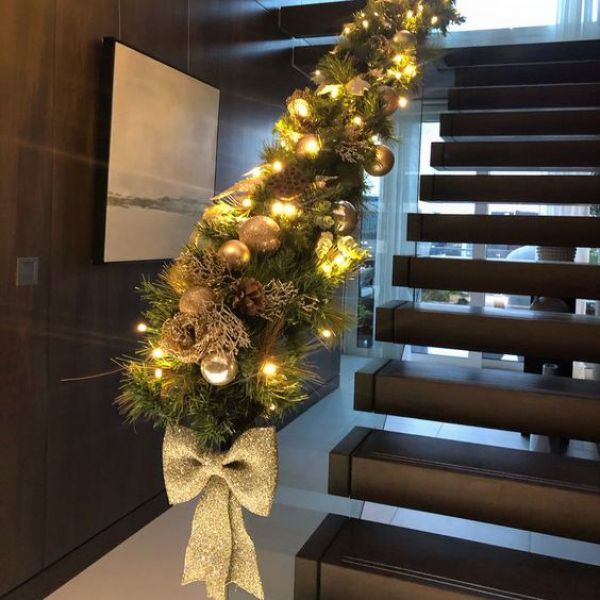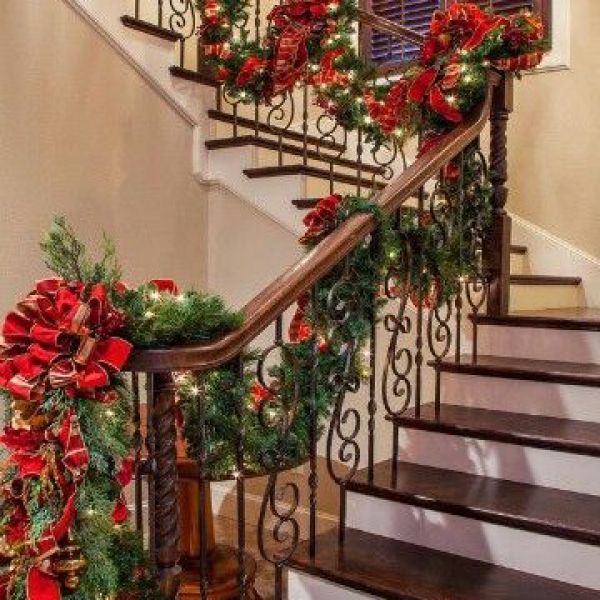 Οι σκάλες είναι το τέλειο μέρος για εντυπωσιακές πράσινες γιρλάντες, μεγάλους φιόγκους, ακόμη και χριστουγεννιάτικες κάλτσες. Ωστόσο, πριν ξεκινήσετε να διακοσμείτε, σκεφτείτε το αρχιτεκτονικό του στυλ. Για παράδειγμα, ένα κάγκελο σε στυλ τεχνίτη με μακριά, ευθεία κουπαστή θα φαίνεται καλύτερα με παραδοσιακές διακοσμήσεις.